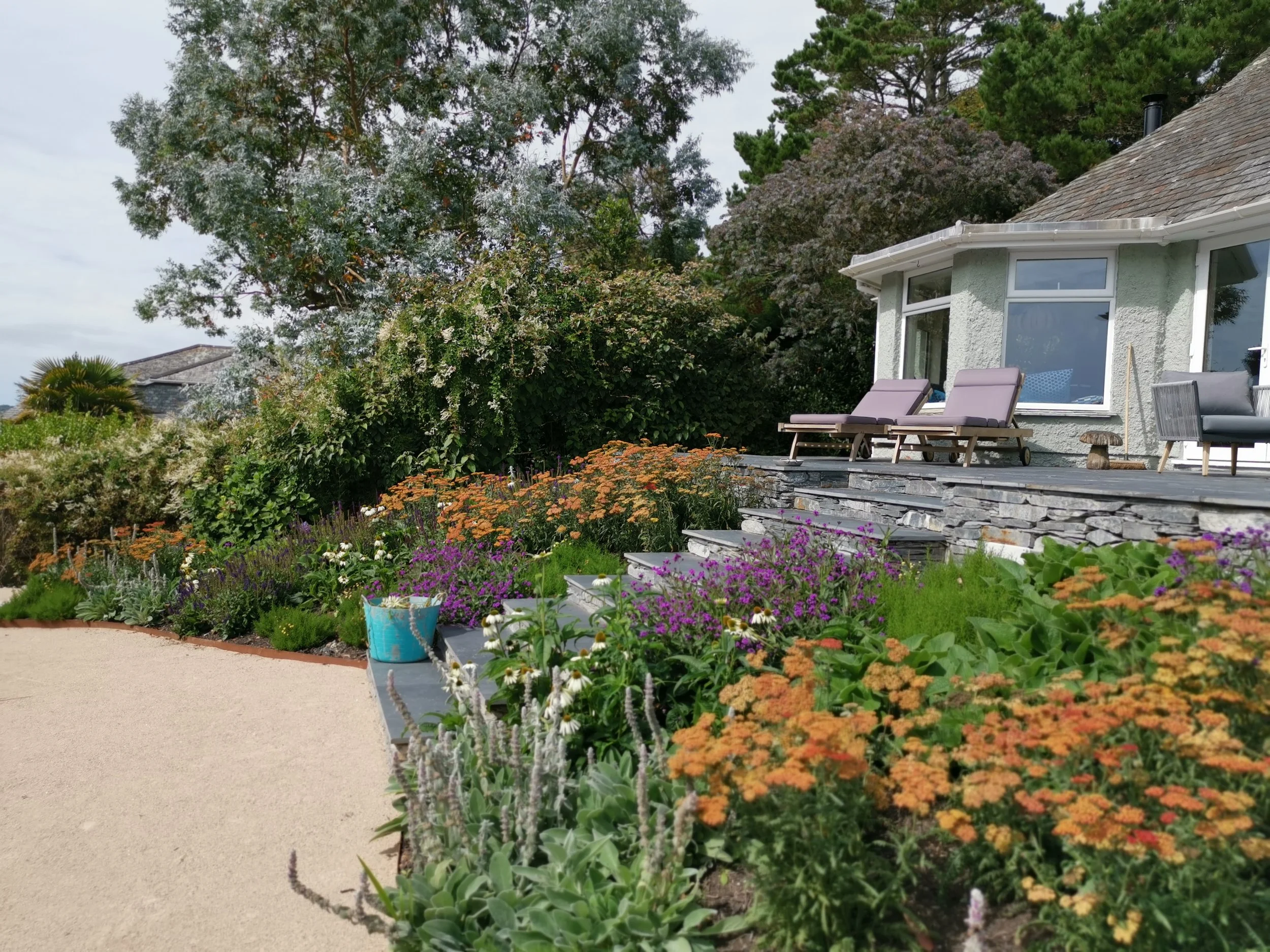 We introduced five new mature multistem Betula pendula which is a beautiful native tree, banks of Osmanthus x burkwoodii and a pleached hedge of hornbeam for winter structure. The upper levels are dominated by large drifts of hot perennials including Echinacea and Verbena and Achillea softening the walls, which create the level change, built from local granite and slate. The lower garden has more of a woodland feel with giant Hostas, grasses, great burnet and Trollius europaeus.
